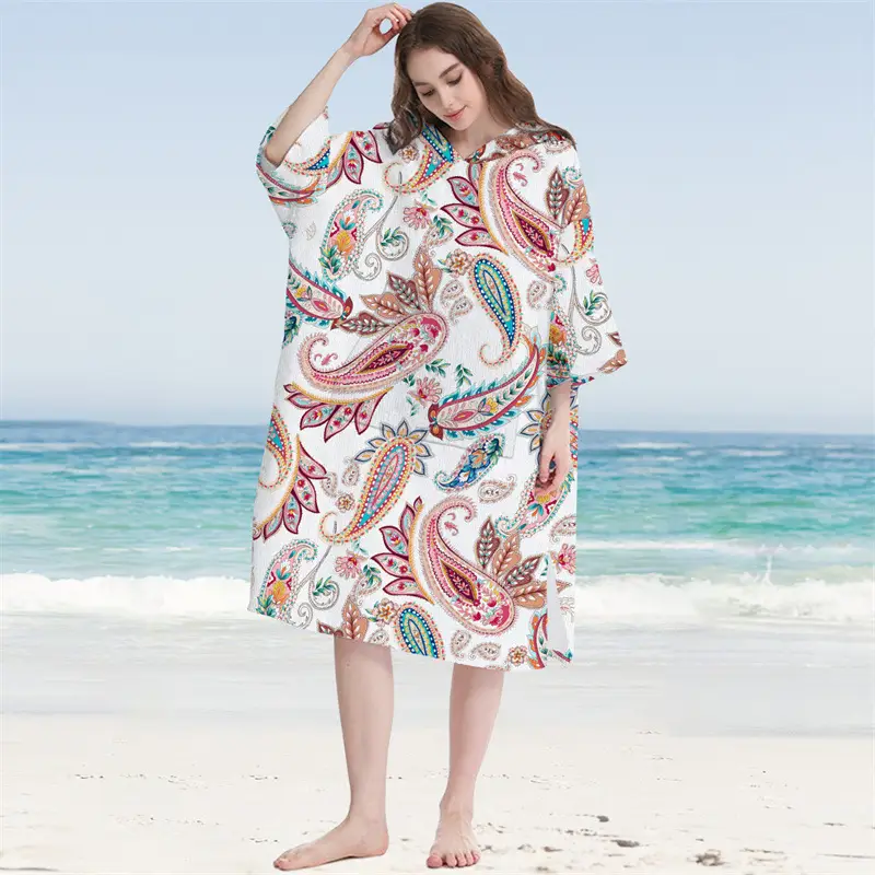 Printed Surf Robe, Surf Poncho with sleeves, 100% Microfiber, Unisex Hooded Beach Towel, Sides sewn, No Button, No Zipper, With Front Pocket. ,1 size for adults (110x75cm: the width is about 75cm, from the shoulder to bottom it is about 110cm.), for 155-180cm tall. About 550g/pc, 55x45x40cm/carton, 30pcs/carton, Opp bag packing.